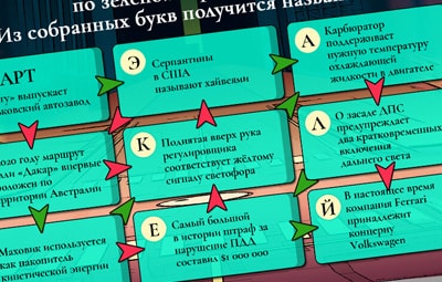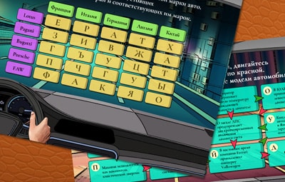 В квесте 15 тематических заданий. Это различные кроссворды, вопросы, головоломки, пазлы, объединенные общей темой автомобилей.
